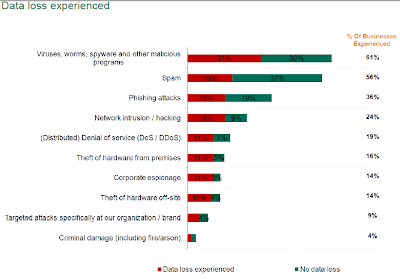 Según el estudio, la amenaza a la seguridad más frecuente se da en forma de virus, programas de espionaje (spyware) y programas maliciosos en general. El 31 por ciento de los ataques de software malicioso ha tenido como consecuencia algún tipo de pérdida de datos y un 10 por ciento de las empresas declara haber sufrido algún tipo de robo de información sensible sobre sus actividades.