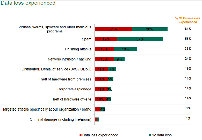 Según el estudio, la amenaza a la seguridad más frecuente se da en forma de virus, programas de espionaje (spyware) y programas maliciosos en general. El 31 por ciento de los ataques de software malicioso ha tenido como consecuencia algún tipo de pérdida de datos y un 10 por ciento de las empresas declara haber sufrido algún tipo de robo de información sensible sobre sus actividades.
